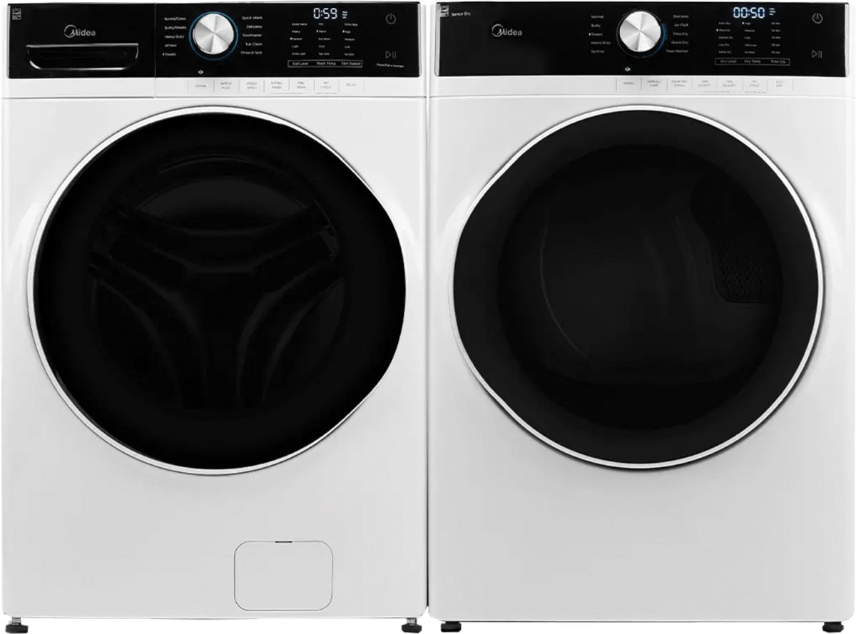 Midea® White Front Load Laundry Pair with a 5.2 cu. ft. capacity front load washer and a 8.0 cu. ft. capacity front load electric dryer.Read More