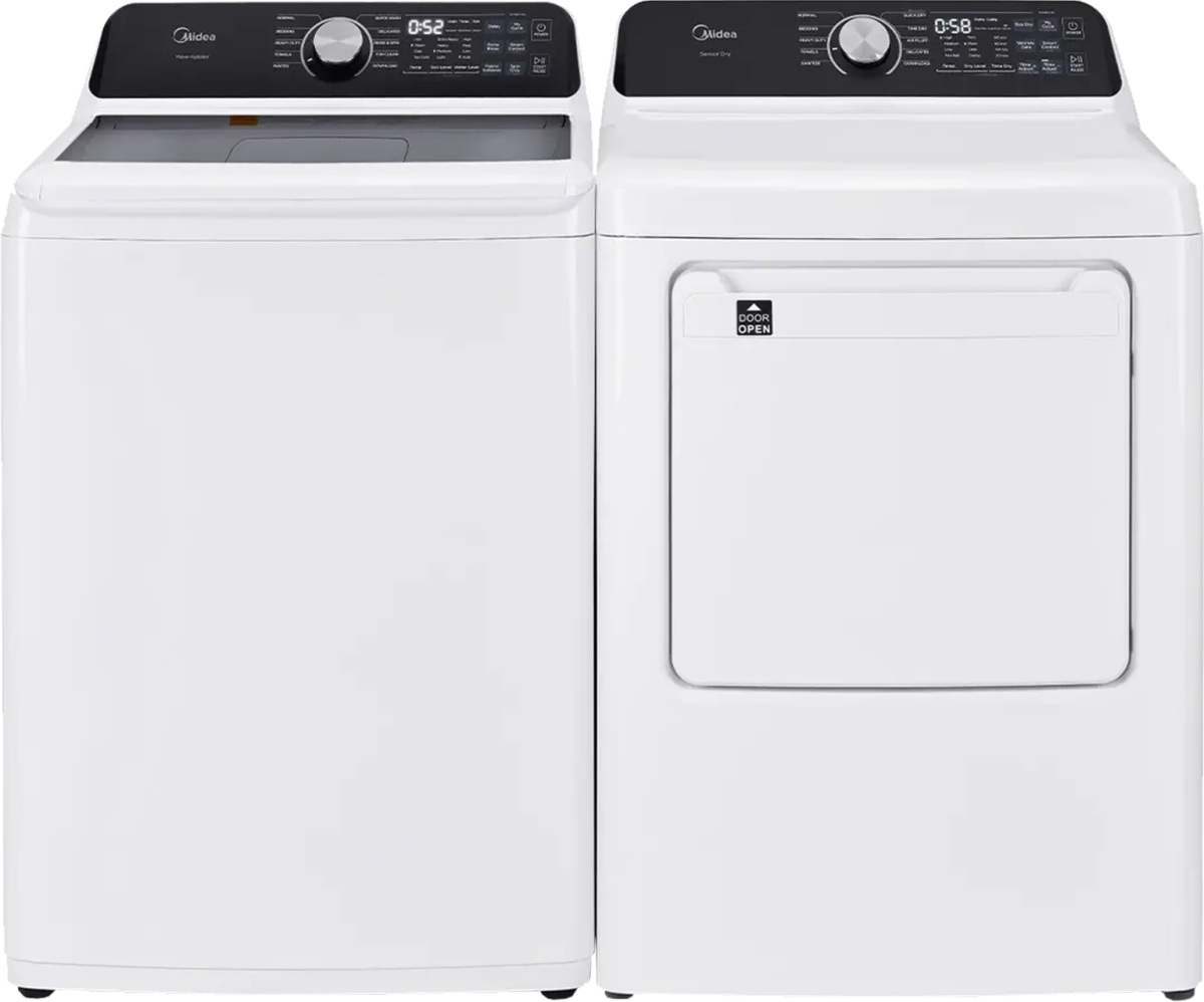 Midea® White Laundry Pair with a 5.1 Cu. Ft. White Top Load Washer and a 7.0 Cu. Ft. White Front Load Electric Dryer.Read More